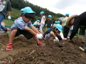 畑に到着してアルムの里の職員さんに収穫の仕方を教えてもらい、さつまいも堀りがスタート!茎を持つと、尻もちをついてしまうくらい力いっぱい引っぱっていました。大きなさつま芋が次々に出てくると、笑顔で大喜びの子ども。大きなお芋が重くて、両手で抱きかかえて運んでいました。