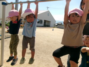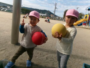 暑さも落ち着き、戸外でも過ごしやすい気候になってきました。砂場、三輪車、鉄棒、ボール遊び。広い園庭で好きな遊びを見つけて、好きな友だちと存分に遊んでいます。友だちと遊ぶ楽しさを知り、元気いっぱいのもも組さんです。