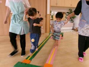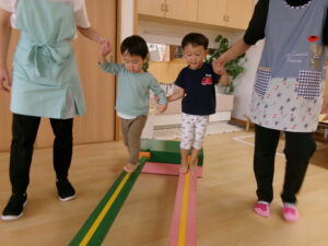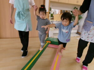 3歳未満児クラスの親子ふれ合い運動会に向けて、巧技台での遊びを取り入れました。一人で渡るのは、怖いけど保育士と手をつなぐと、やる気満々の子ども達です。進む先をしっかり見つめて、一歩ずつ慎重に前進していました。運動会当日は、お家の方と一緒に笑顔で楽しみたいと思います。