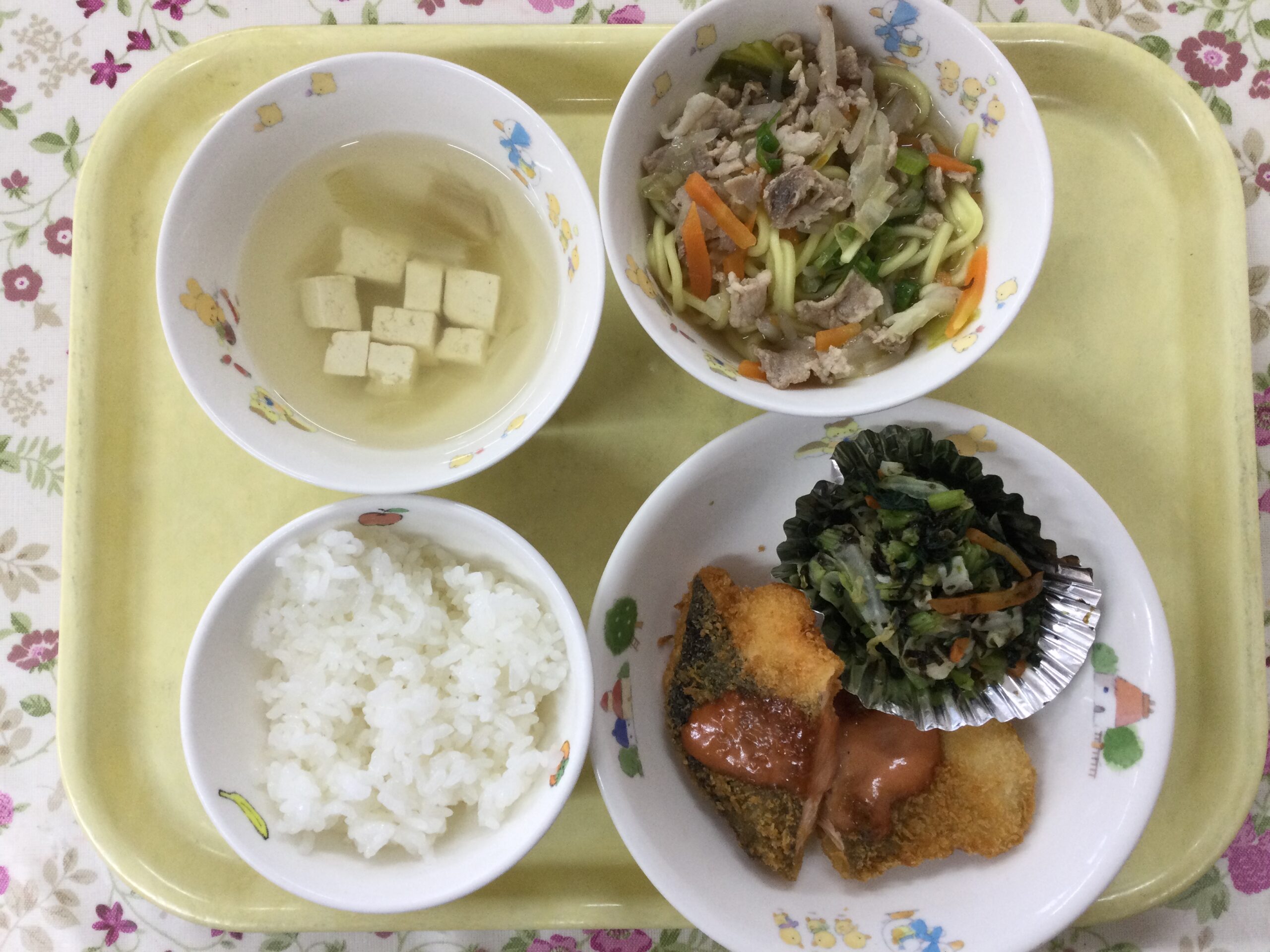ごはん、さけのオーロラソースかけ、青菜の磯浸し、すまし汁