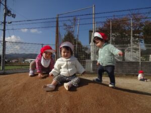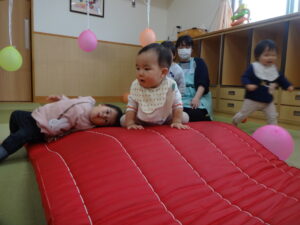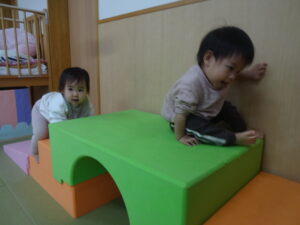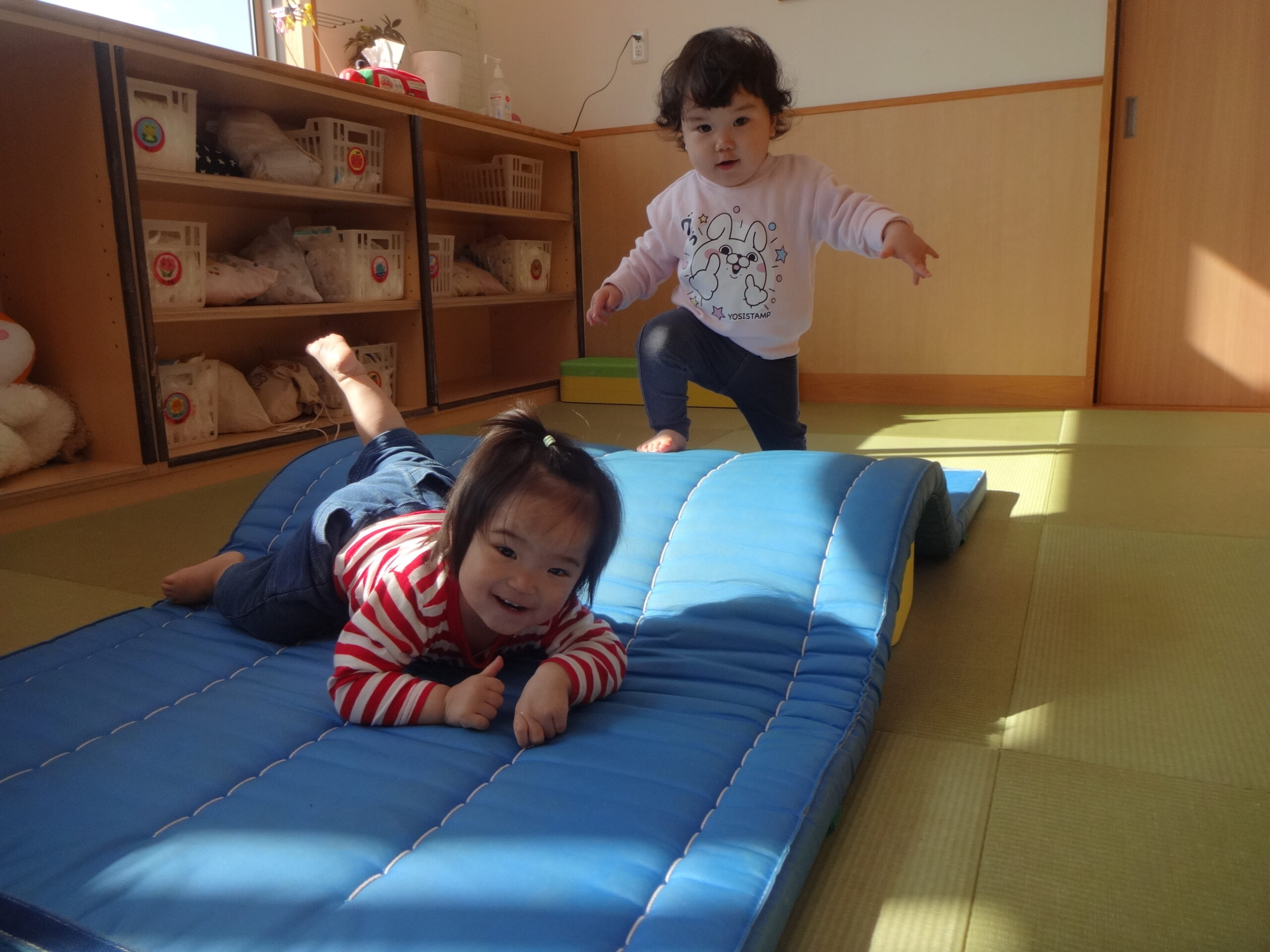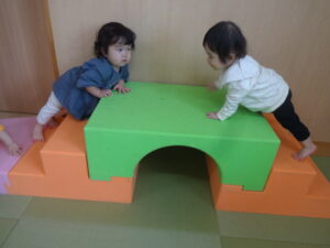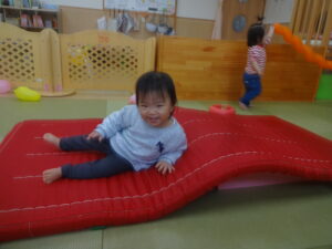 寒くなり、一人ひとりの体調に気を付けながら室内でたくさん体を動かして遊んでいます。手足の力がつき、ダイナミックに遊ぶことが増えてきたちゅうりっぷ組さん。マットの山から豪快に滑り降りたり、転がったりすることが特にお気に入りです。大型階段遊具のハイハイプレイをバランスをとりながら上り下りするのも上手になり、外では園庭の土山にも力いっぱい上れるようになっています。