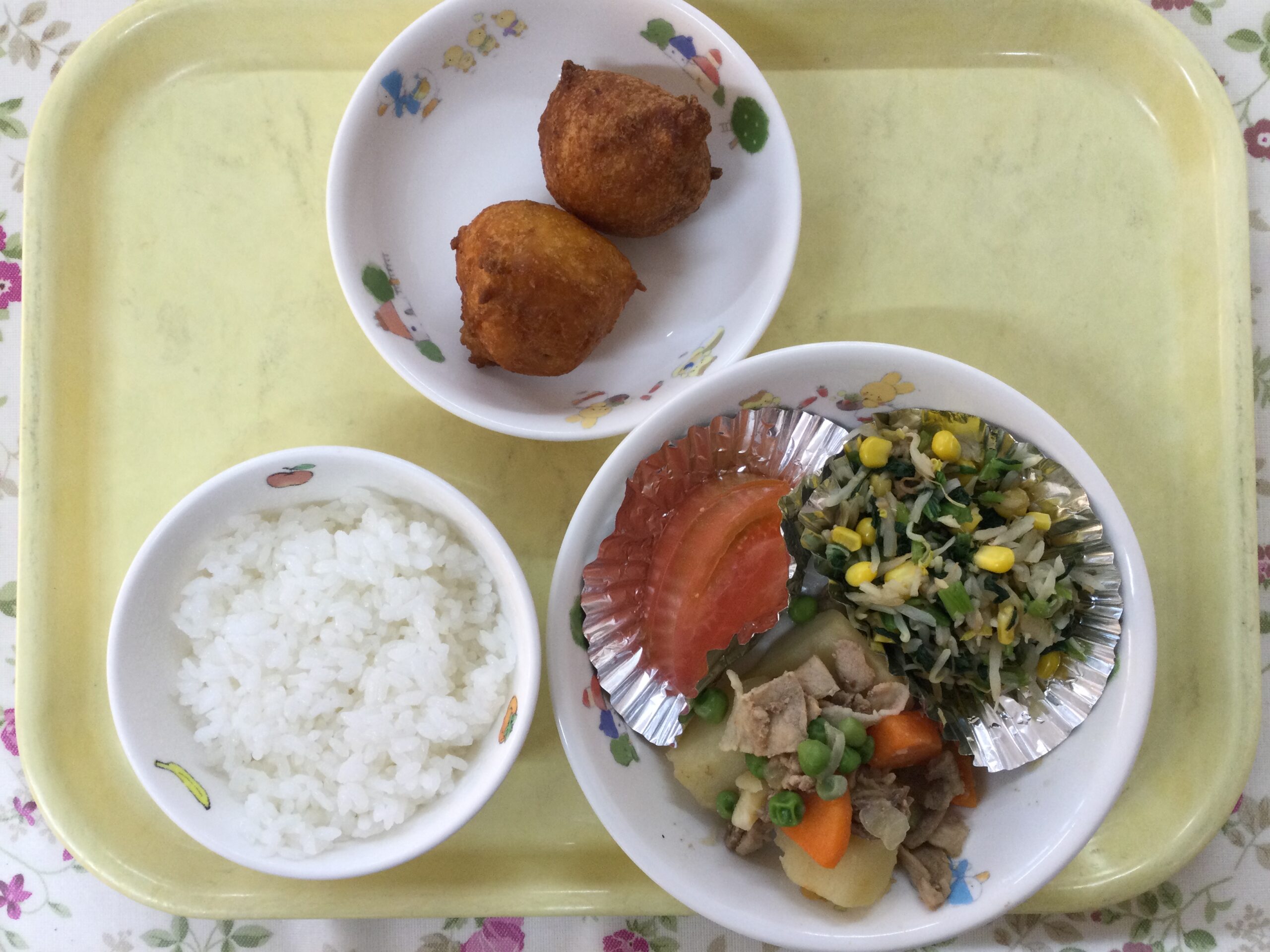 ごはん、肉じゃが、もやしの彩りあえ、トマト