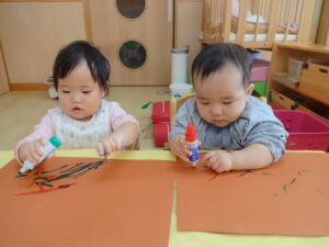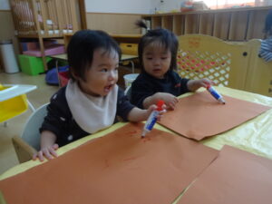 もうすぐやってくるクリスマスに向けて、ツリーの制作をしています。最初に、ツリーの土台で茶色の画用紙にカラーペンでなぐりがきを楽しみました。のびのびと手を左右に動かしたり、点々を描いたりして思い思いに楽しんでいます。