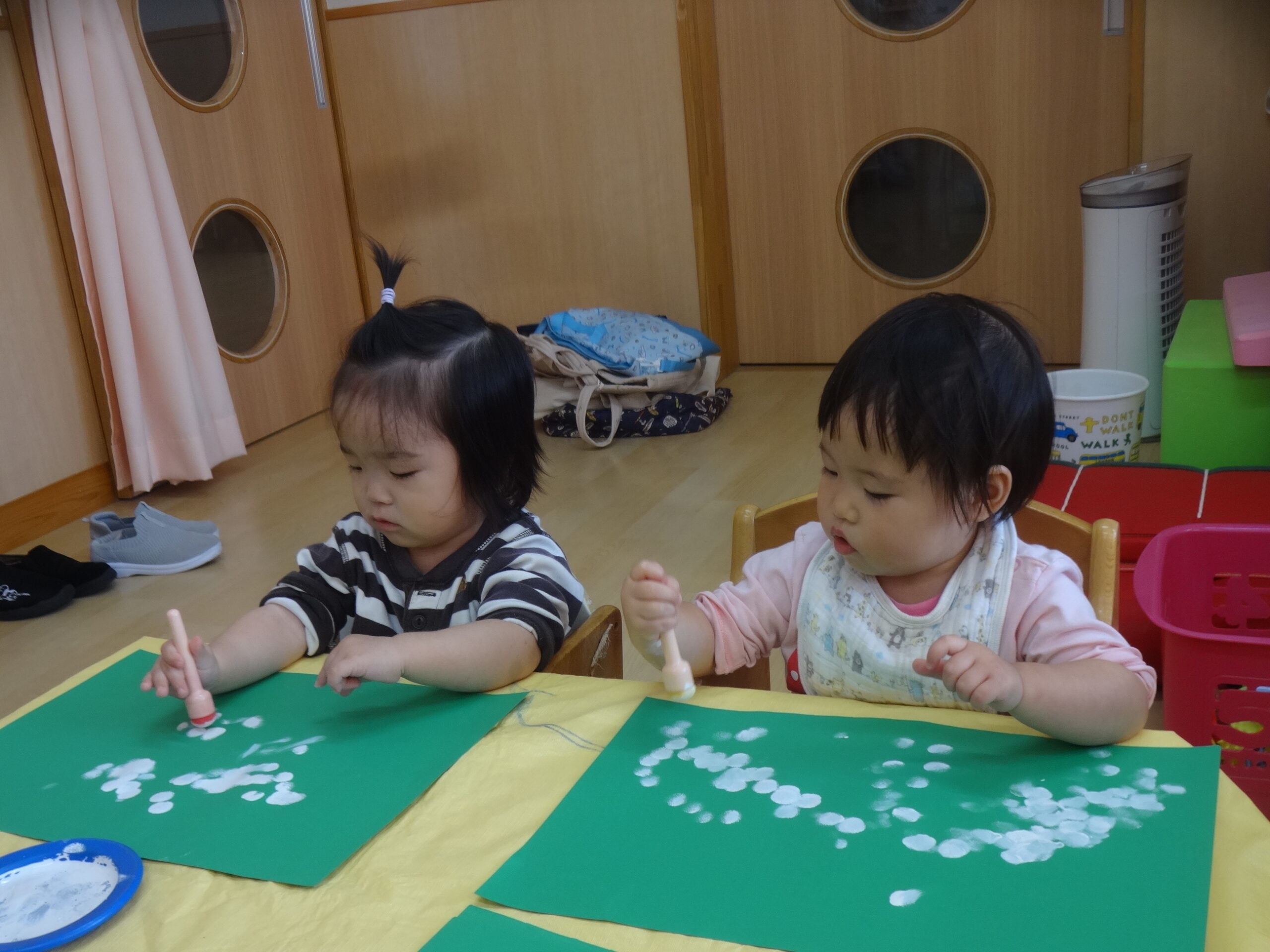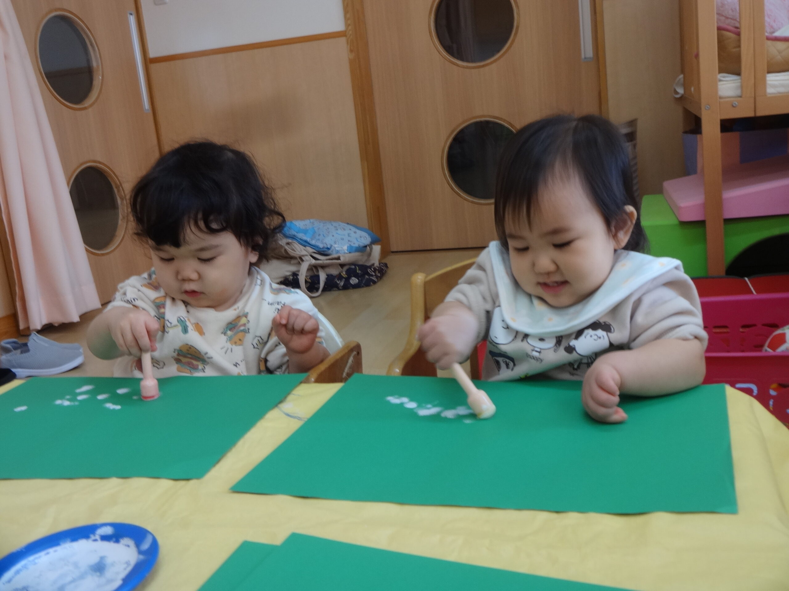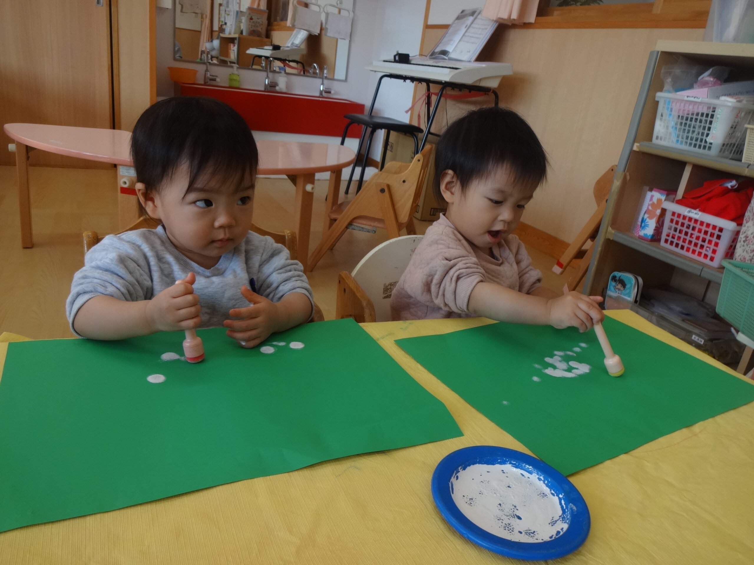 その後、緑色の画用紙に白い絵の具でタンポをポンポン押して、ツリーの模様を作りました。絵の具が入っている容器に「付けるよ。」と伝えると、真似して付けようとしたり、手に付いた絵の具を『にぎにぎ』して感触を楽しんだりする様子が見られました。これから、クリスマスの雰囲気をたくさん楽しんでいきたいと思います。